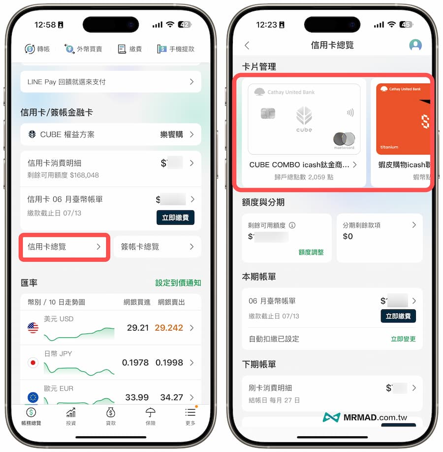 開啟國泰世華CUBE APP後,並且從首頁點選「信用卡總覽」,並選擇頂部「卡片管理」。