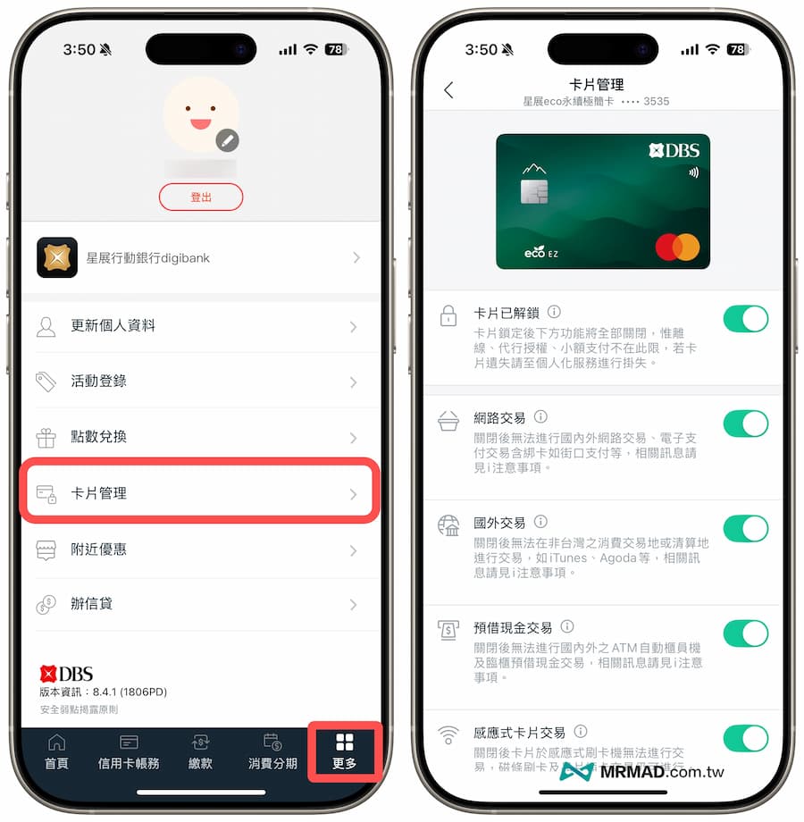 星展銀行也針對星展信用卡加入安全鎖功能,只要利用自家星展APP(iOS、Android)同樣能直接線上操作設定:
