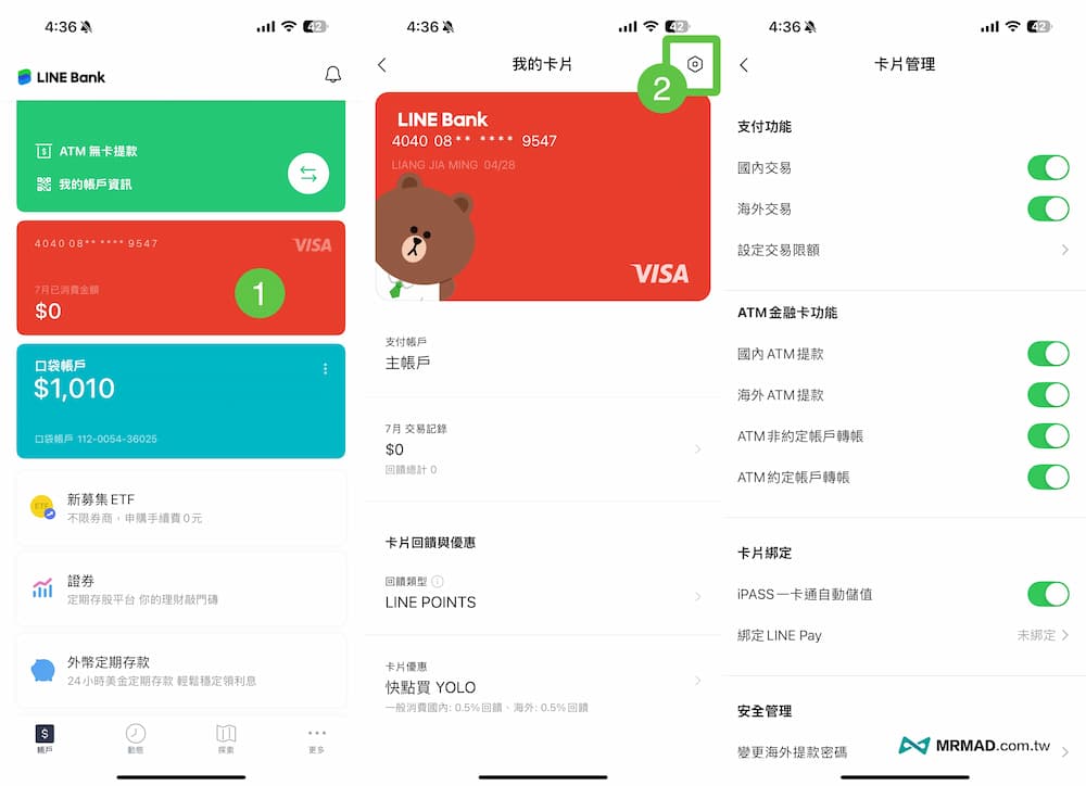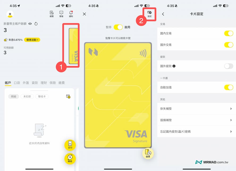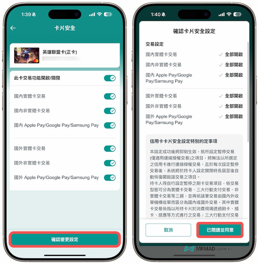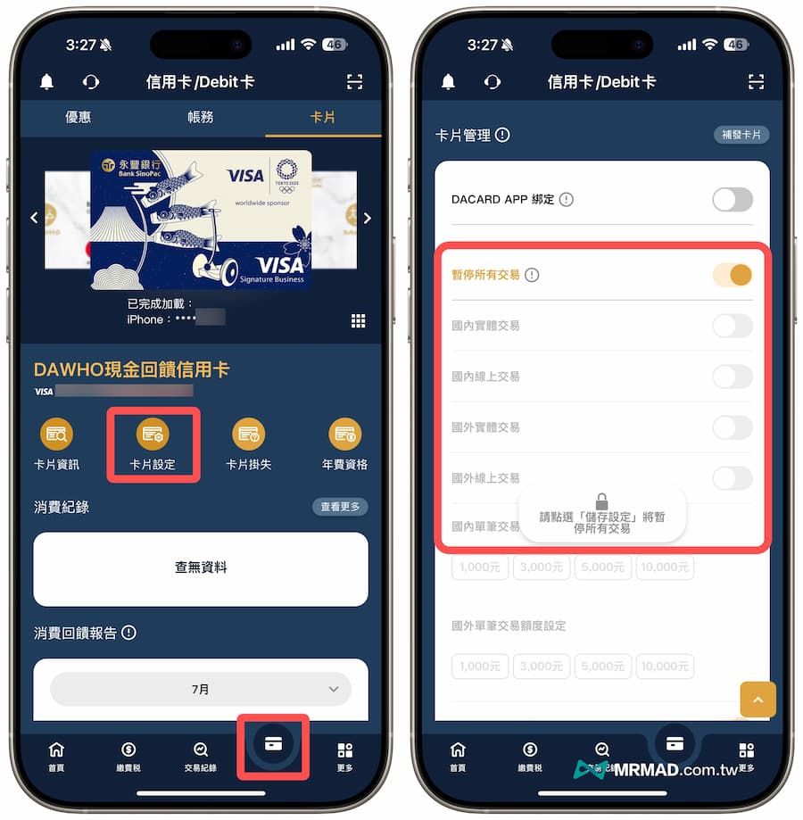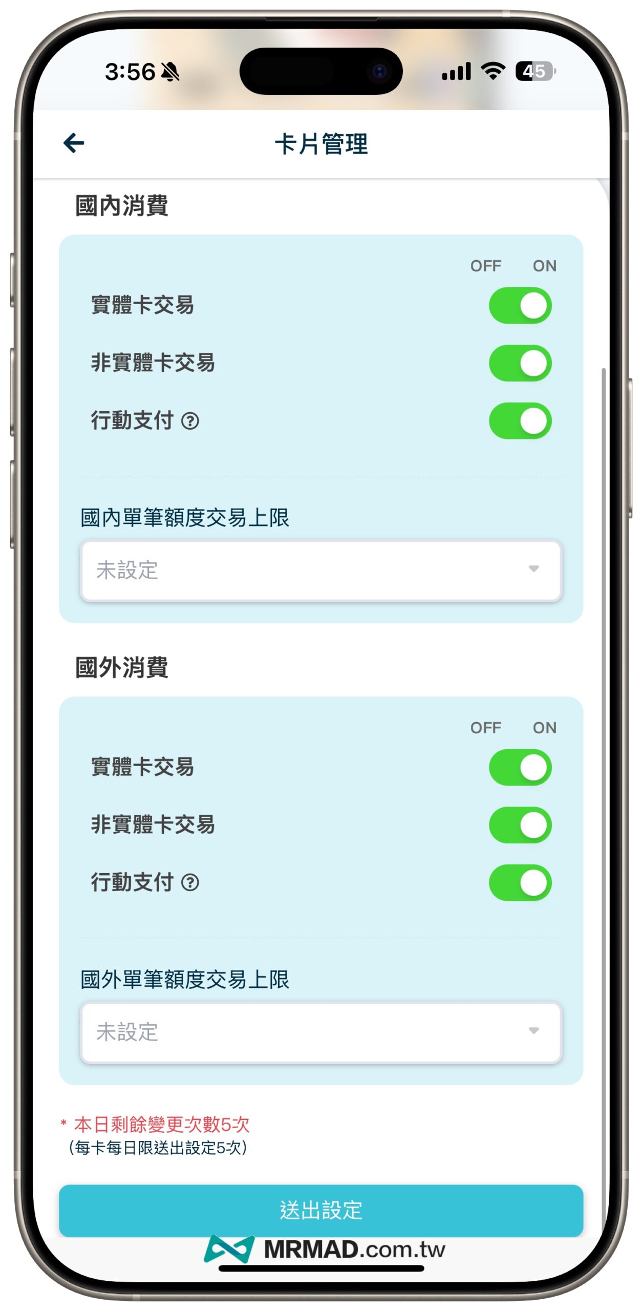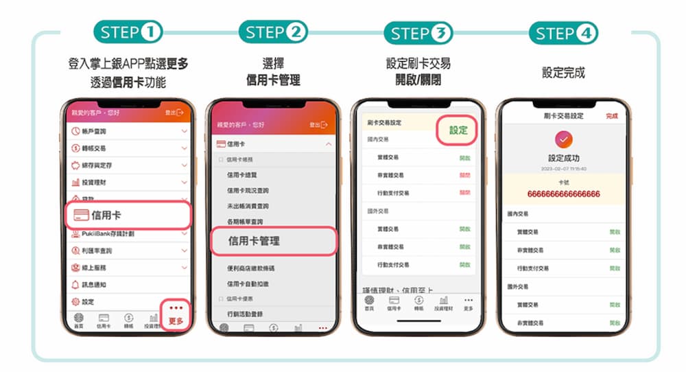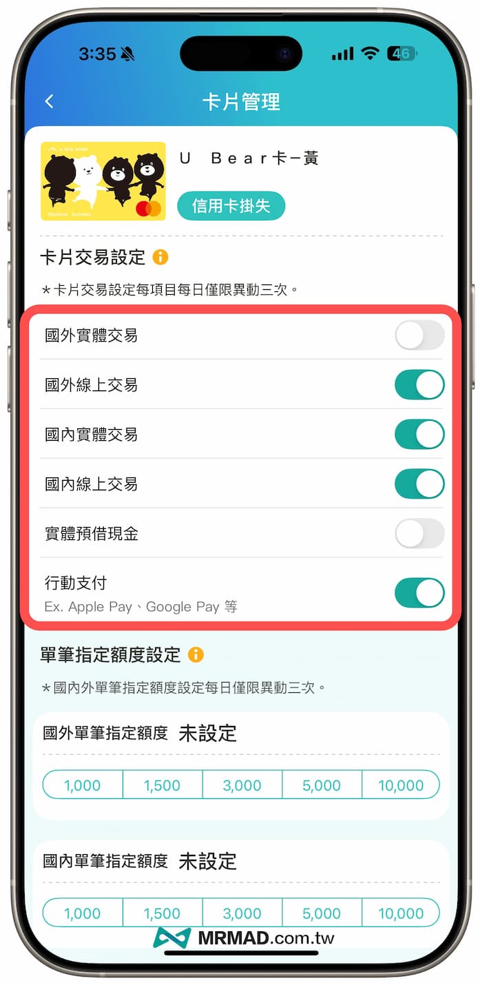 - 就能選擇要開啟或關閉信用卡交易功能選項