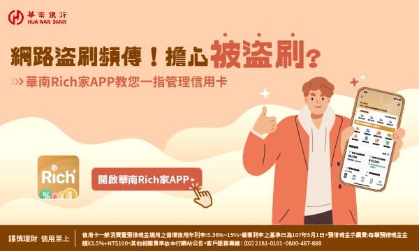 華南銀行同樣有針對信用卡加入卡片鎖功能,可以透過「華南Rich家APP」(iOS、Android)來開啟或關閉國內外刷卡交易設定,詳細步驟如下: