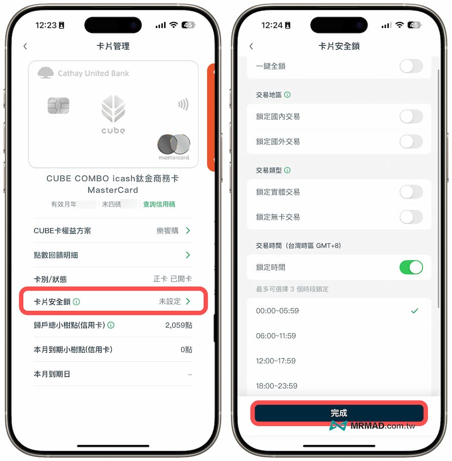 會比較建議國泰信用卡片鎖交易時間,可自行選擇三個時段鎖卡無法交易,像是能設定在睡覺期間都不允許刷卡,就能避免晚上被盜刷。