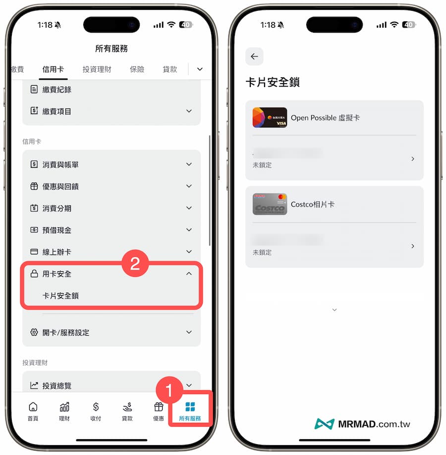 - 選擇「信用卡安全鎖」即可關閉國內/國外交易設定