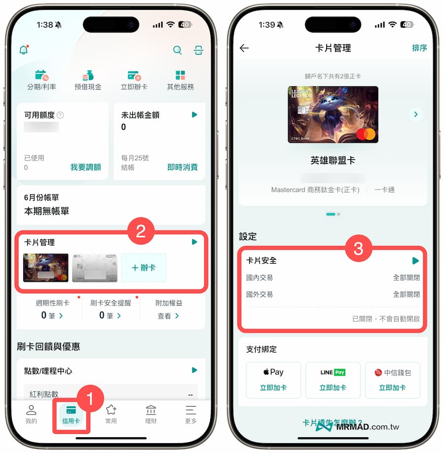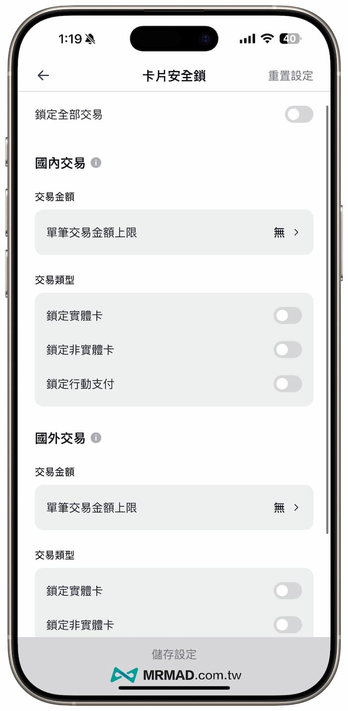 在中國信託信用卡安全鎖設定內,主要有提供過內外實體卡交易、非實體卡交易和Apple Pay/Google Pay/Samsung Play交易功能,要是平常不需要刷卡使用就建議全勾選關閉。