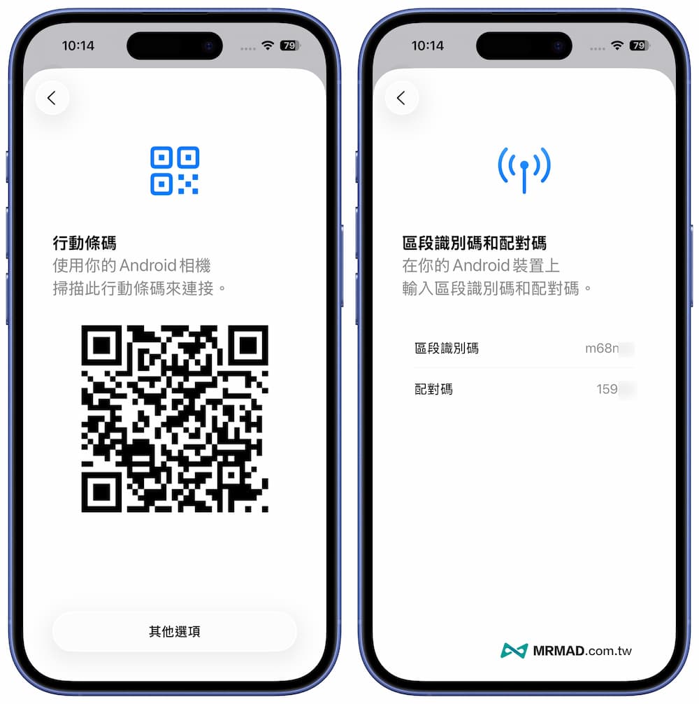 接下來系統就會產生一組 QR碼在iPhone畫面上,只要將Android手機對準掃描就能連接,要是無法打開相機,也可以點擊「其他選項」,可以直接在Android設備上輸入區段識別碼和配對碼,進入轉移程序。