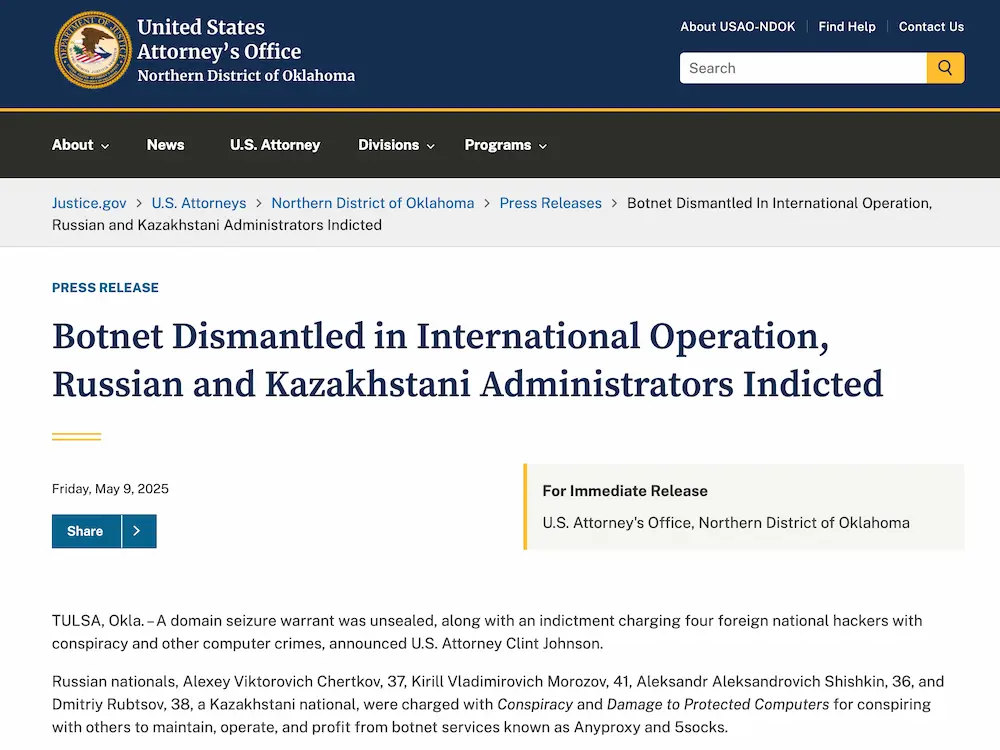 美國聯邦調查局(FBI)與司法部目前已查封該集團所營運的網站「Anyproxy.net」與「5Socks.net」,但主嫌仍下落不明。