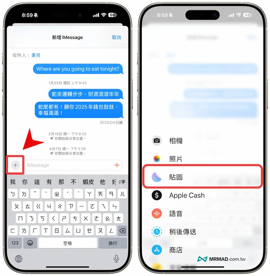 接著直接打開內建「訊息(iMessage)」App,並且從聊天室內點左下角「+」,選擇「貼圖」。