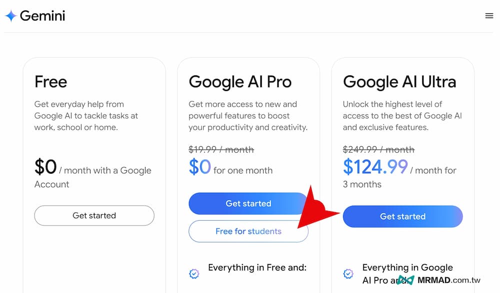 隨後就可以打開「Google AI Pro學生資格領取頁面」,按下Google AI Pro 區塊底下的「Free for students」。