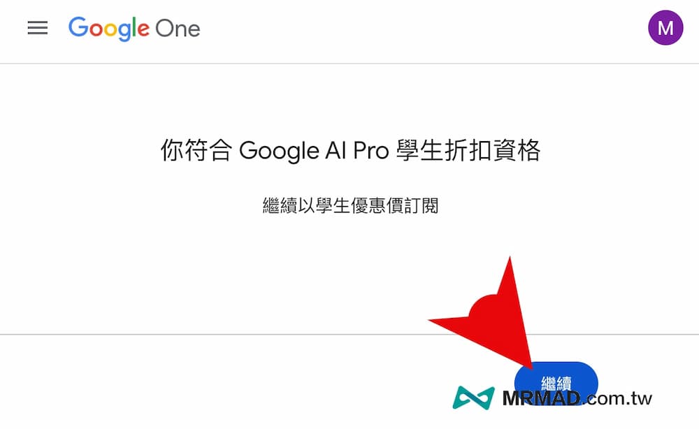 最後看見「你符合Google AI Pro學生折扣資格」,就可以點擊「繼續」。