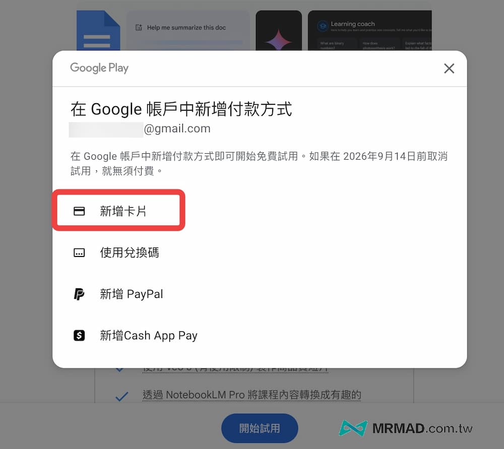 要正式開啓免費Google AI Pro試用前,會進入 Google Play 要求新增付款方式流程,直接點選「新增卡片」。