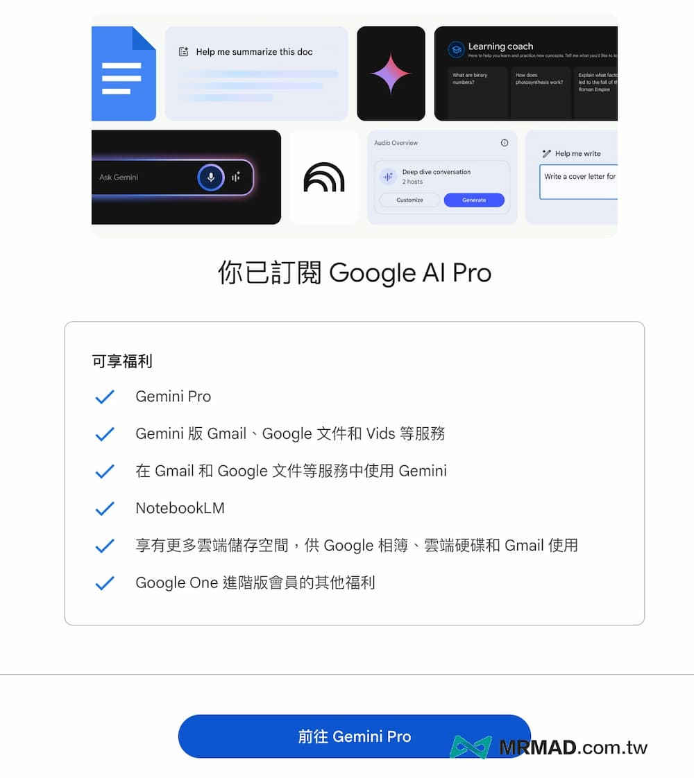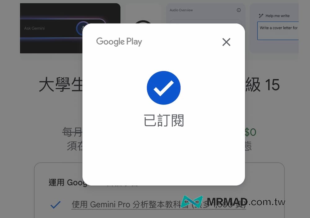 最後會跳出從今天開始算起15個月都能免費用Google AI Pro(2TB)資格,直到2026年才會開始收費,都確認後就點擊「訂閱」。