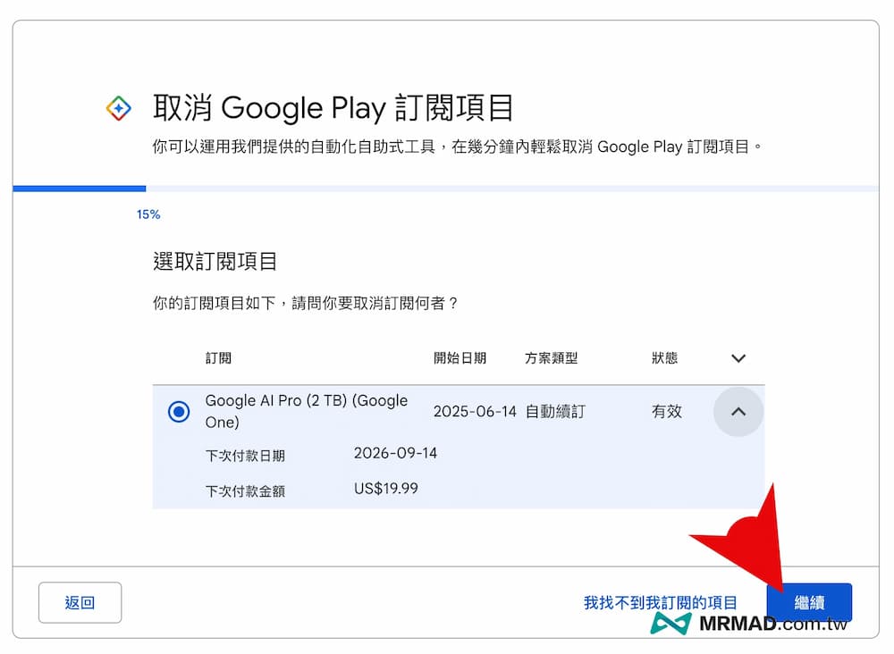 直接點選 Google AI Pro(2TB)訂閱項目後,並且按下「繼續」。