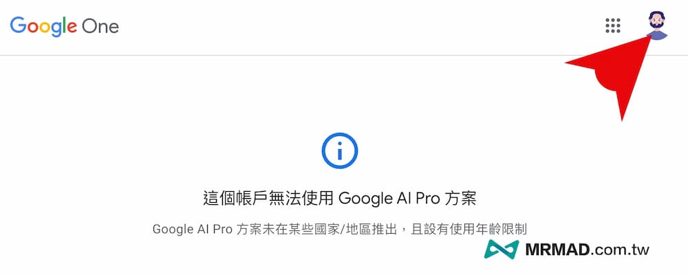 接下來要是跳出「這個帳號無法使用Google AI Pro方案」警告提示,先確認右上角是不是剛申請的新帳號。