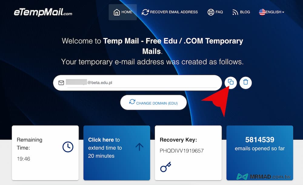 直接開啟「etempMail生成信箱網頁」,只要開啟網頁就會自動隨機產生一組免費國外edu信箱,點擊右側「複製」按鈕將信箱位置複製起來。