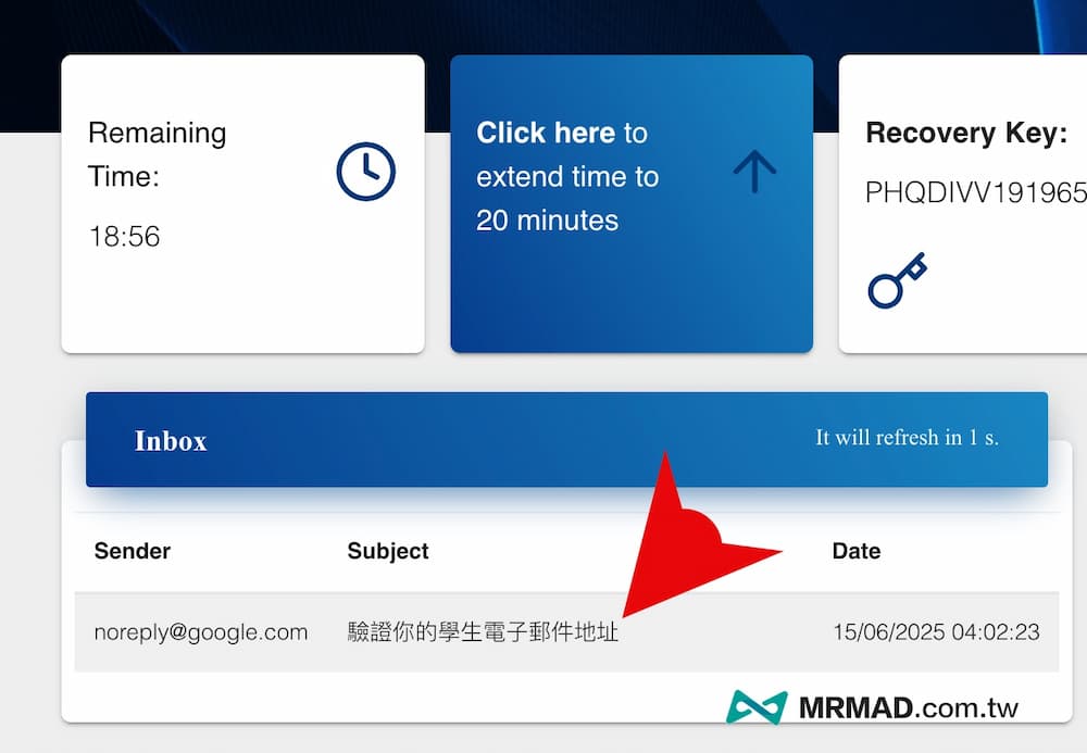 隨後再回到 etempMail 網頁,在下方 Inbox 區塊會看見一封 Google 寄來的驗證學生電子郵件通知信,直接點開複製裡面的驗證碼。