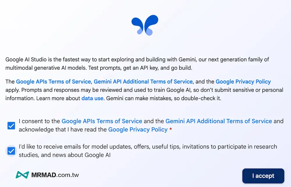 進入後會跳出 Google AI Studio 聲明同意,直接將兩個選單都勾選後,按下「I accept」繼續,後續過程也會需要登入 Google 帳號才能使用。