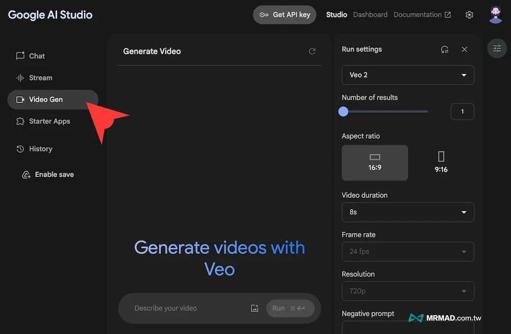 在進入 Google AI Studio 工作室後,直接從左側切換到「Video Gen」影片生成功能。
