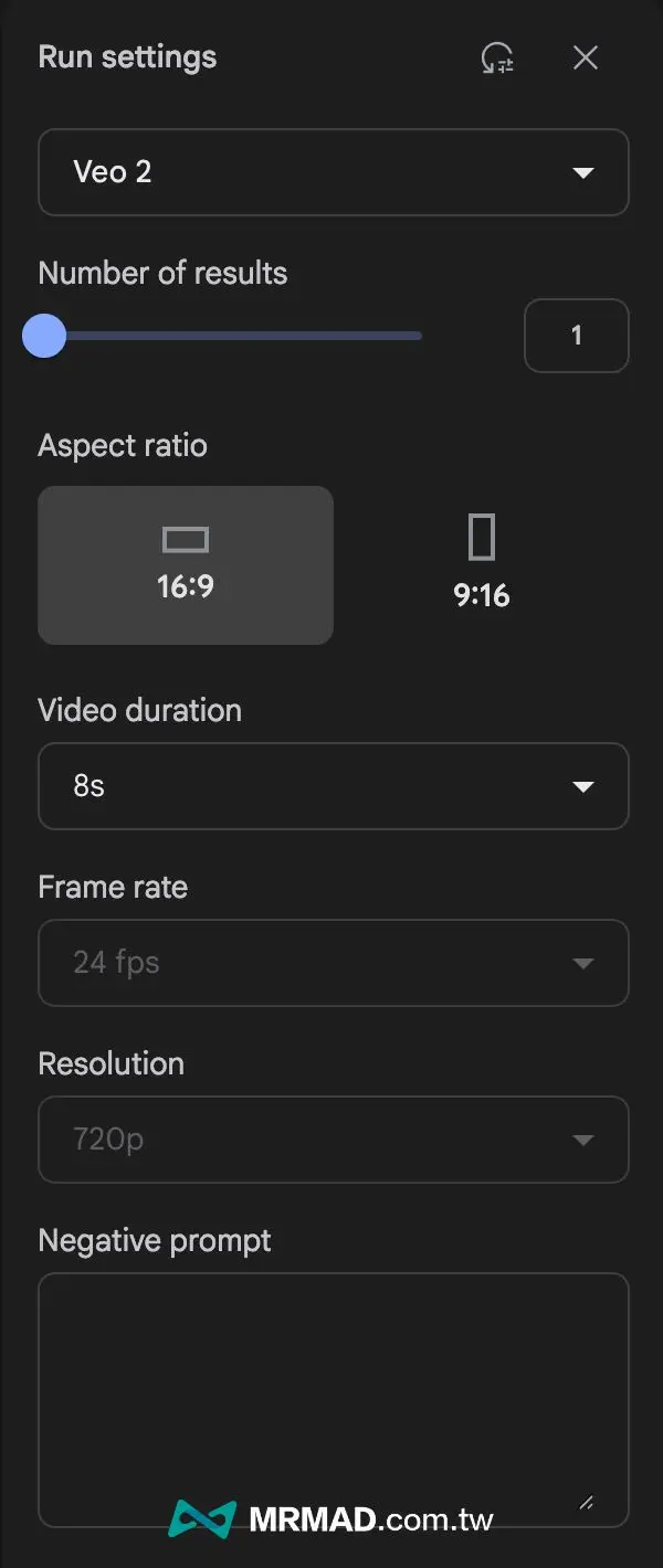 接者先從側邊選擇想使用的模型,目前只有Veo 2能夠選擇,底下可依照提示自行設定: