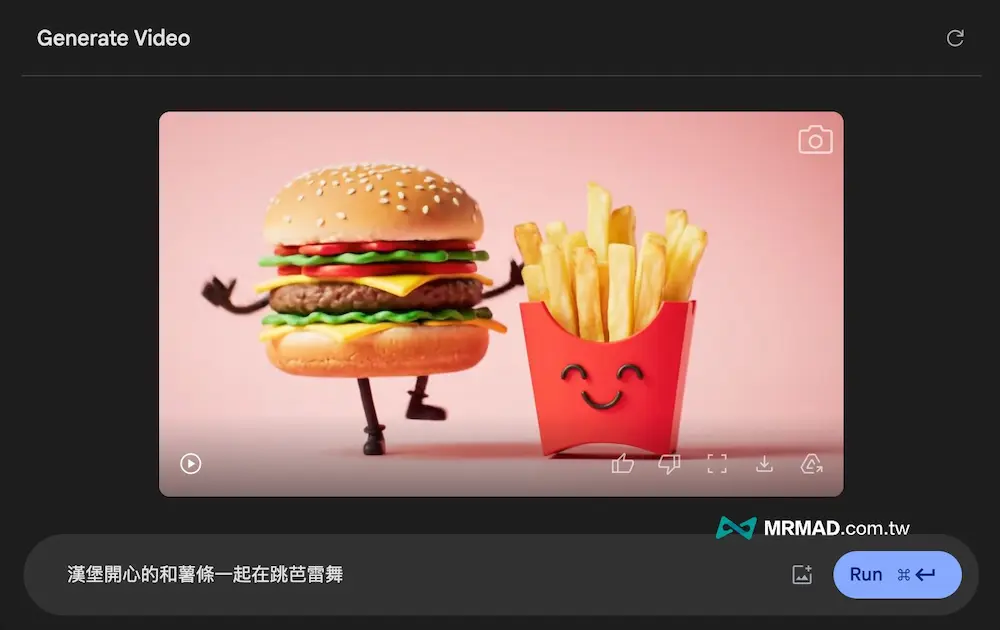 如不知道怎麼輸入描述,可以先填寫「漢堡開心和薯條一起跳芭雷舞」,並且按下「Run」就會開始生成出短影片。