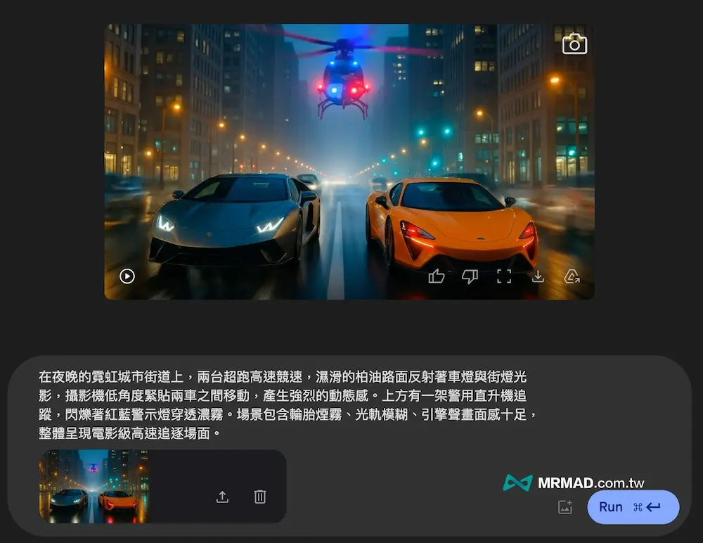 範例:在東京街頭,一台紅色跑車正在夜間飄移,畫面以慢動作加霓虹燈閃爍呈現,帶有電影感的寫實風格。