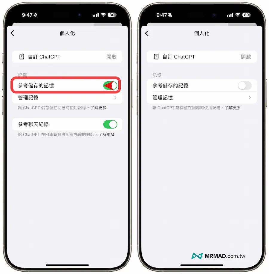 並且將「參考儲存的記憶體」功能關閉,就能停用ChatGPT記憶功能,就能避免AI會持續收集用戶性格和資料來回答問題。