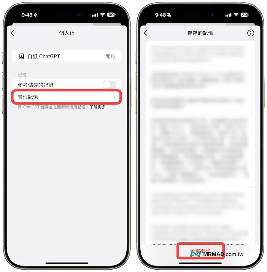 除了關閉ChatGPT記憶功能外,實際之前被記憶的使用習慣同樣還是被保存起來,可以透過ChatGPT個人化設定內,點擊「管理記憶」,從裡面點擊「全部刪除」就能一次清空ChatGPT對我們的記憶資料。