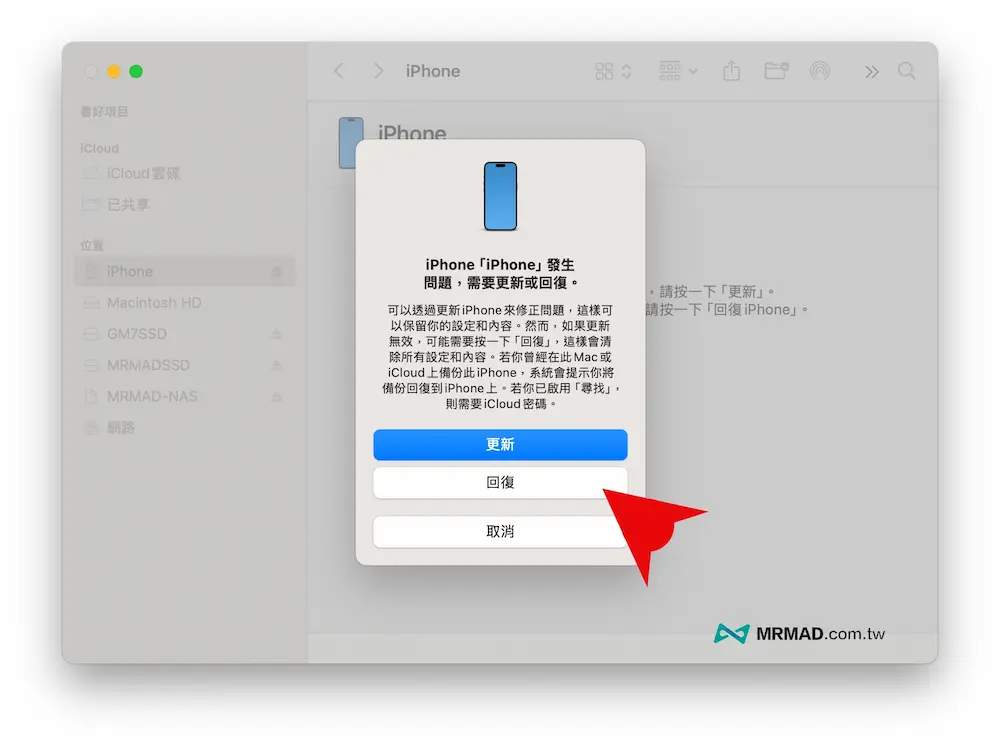 當 Finder 或 iTunes 偵測到處於回復模式的 iPhone 時,會跳出需要更新或回復提示視窗,直接透過手動載入剛下載 iOS 18.5 iPSW 檔案,依照系統不同操作如下: