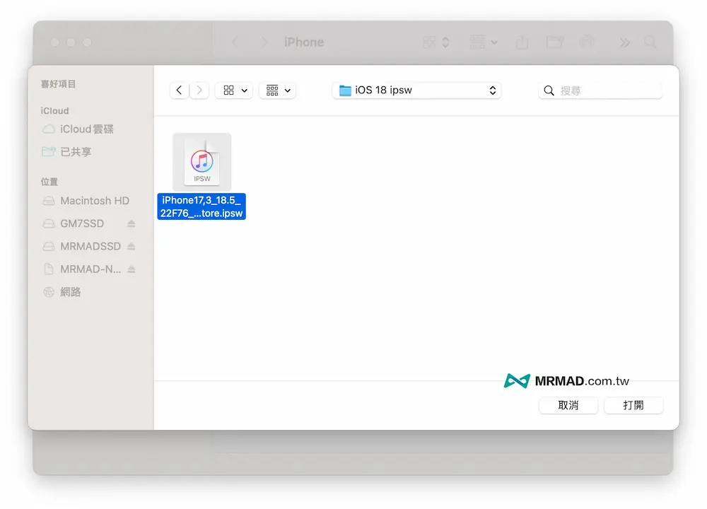這時會彈出瀏覽電腦上的檔案視窗,直接找到之前下載的 iPSW 檔案,選擇後點擊「打開」。