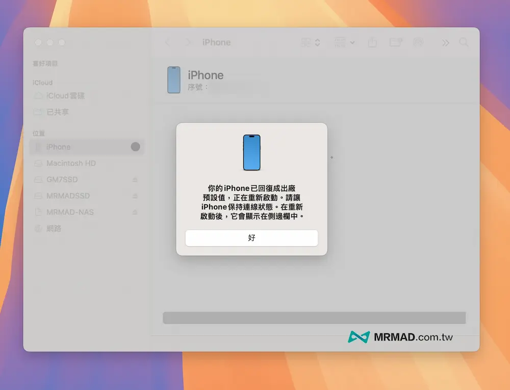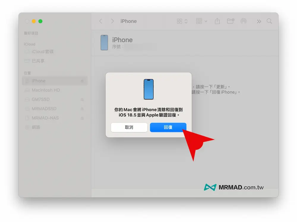 接下來 iTunes 或 Finder 會提示確認是否要清除裝置並恢復到選定的 iOS 版本,直接點擊「回復」繼續。