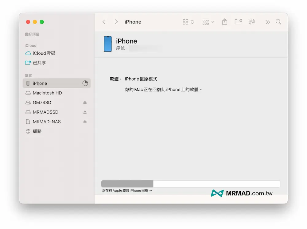 這時候 iTunes/Finder 會開始解壓縮 iOS iPSW 檔案,並將系統安裝到 iPhone 裝置,這個過程可能需要一些時間,要確定電腦和裝置都保持在連接狀態下,過程也都不要拔線中斷操作,避免裝置可能會發生失敗導致白蘋果。