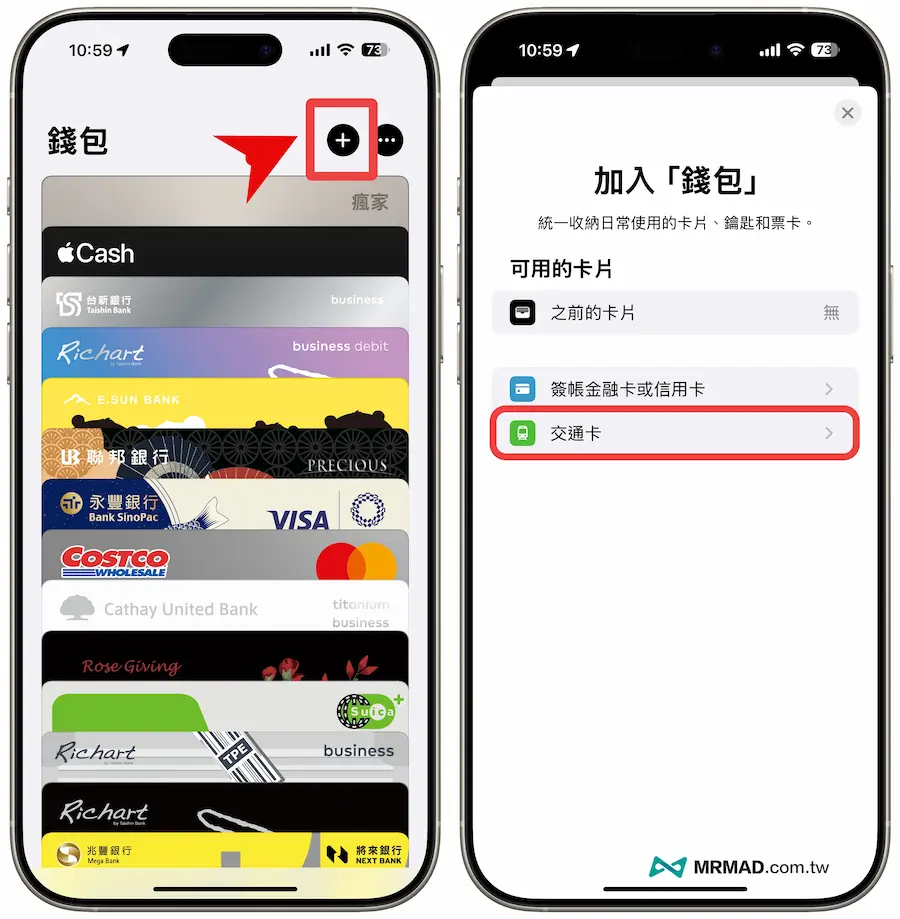 首先開啟 iPhone 內建「錢包(Wallet)」App,並且點右上角「+」選擇「交通卡」。