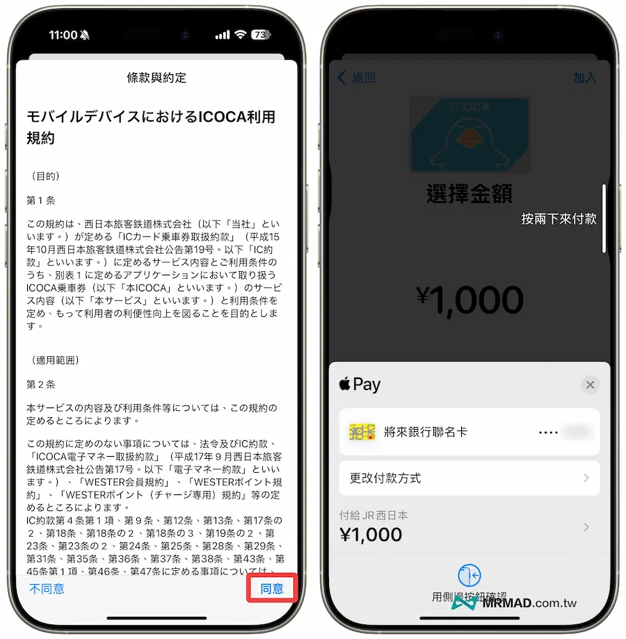 在點擊同意規約後,就能透過 Apple Pay 付款,能夠支援 VISA/Mastercard/JCB/AMEX 等國際信用卡。