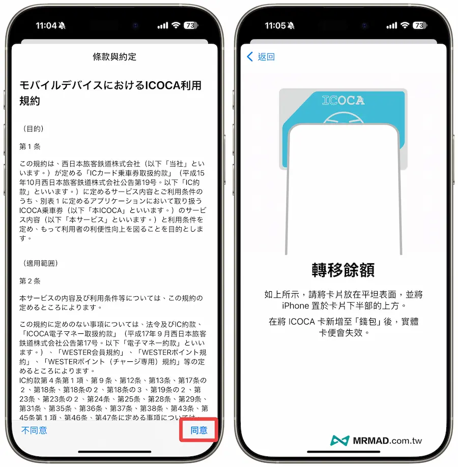 最後點同意約定條款後,依照畫面提示將iPhone頂部畫面靠在實體ICOCA卡片上,就能將實體卡片轉移到iPhone內,等待系統自動讀取與轉移(約需 1 分鐘),就會變成一張ICOCA數位卡片。