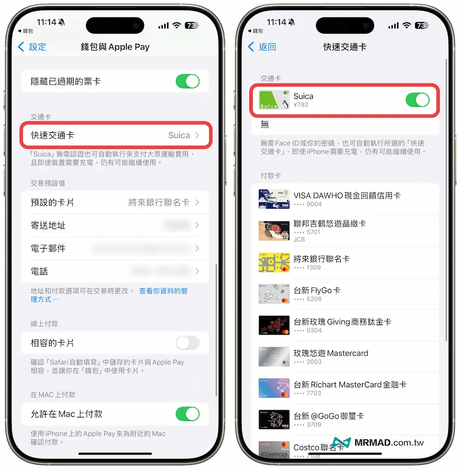 步驟 2. 會自動開啟錢包與Apple Pay設定頁面,點擊「快速交通卡」後,選擇現有交通卡如ICOCA或Suica,當設定後,後續就都會用這張交通卡來感應支付。