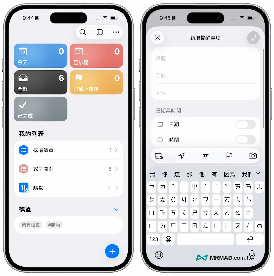 要是長按「新增提醒事項」控制項,也會顯示目前現有的提醒任務列表選單,就能夠快速新增自定清單分類、備註、到期時間、地點及旗標等欄位。