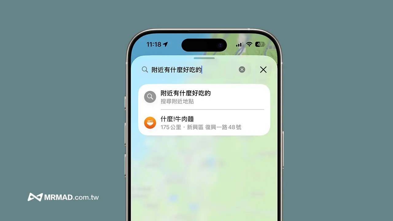 只要在升級 iOS 26 後,打開內建Apple地圖,就可以像與朋友聊天輸入「附近有什麼好吃的」,就能立即顯示相關推薦餐廳店家資訊。