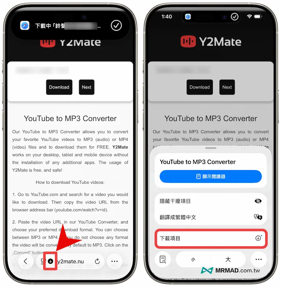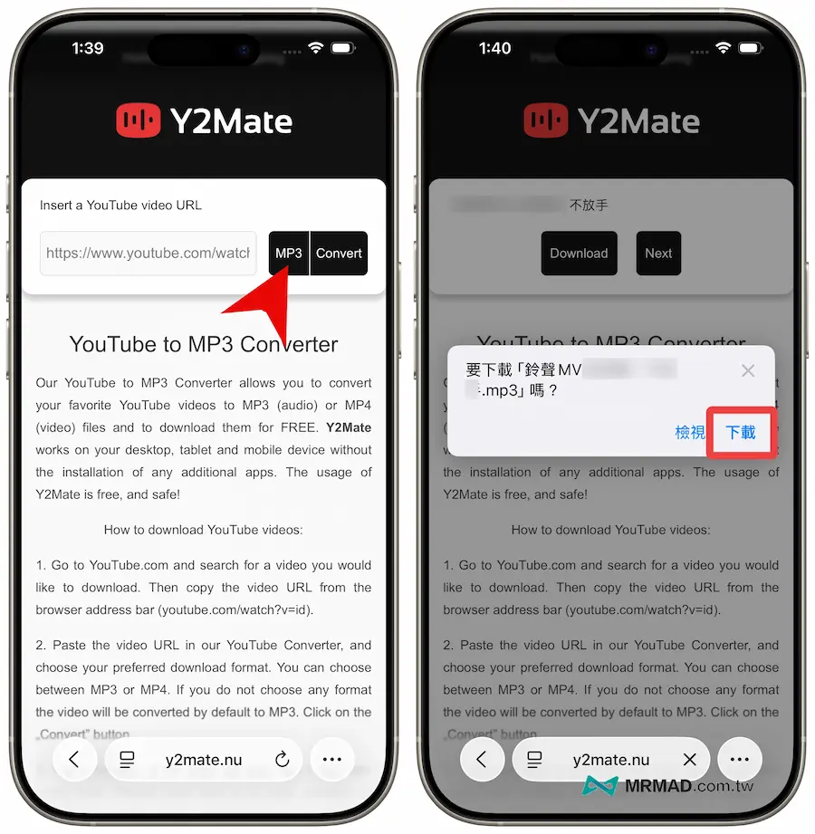 要是想直接用YouTube影片轉成MP3音樂,也可以透過iPhone內建Safari瀏覽器開啟Y2Mate網站,該網頁能在線上將影片轉換成MP3音樂,只要貼上YouTube網址,並按下「Convert」轉換就會跳出下載 MP3 檔案提示。