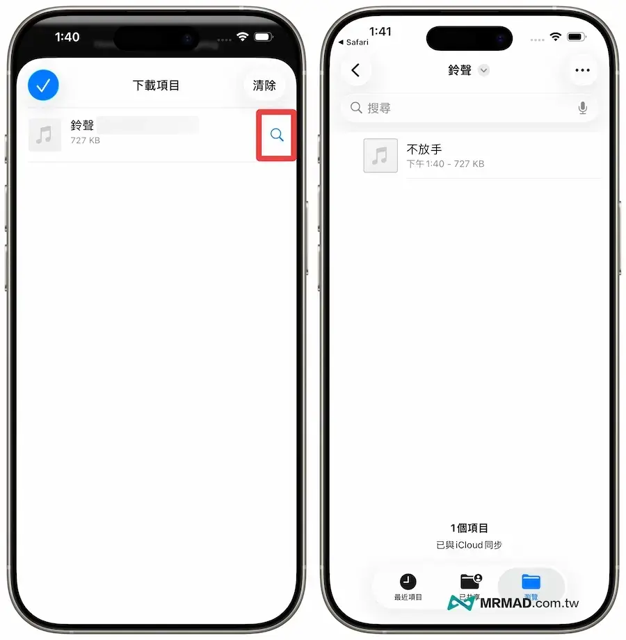 隨後從下載項目列表,點擊「放大鏡」圖示,會自動開啟「檔案App」儲存位置,要先重新設定音效檔案名稱,避免後續套用,iOS 26 系統設定會直接以當前音效檔作為鈴聲名稱。