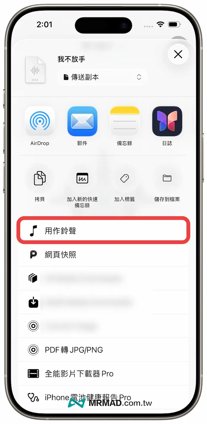 在分享選單內,直接點擊「用作鈴聲」功能,就會直接將該音效檔案直接套用成iPhone鈴聲