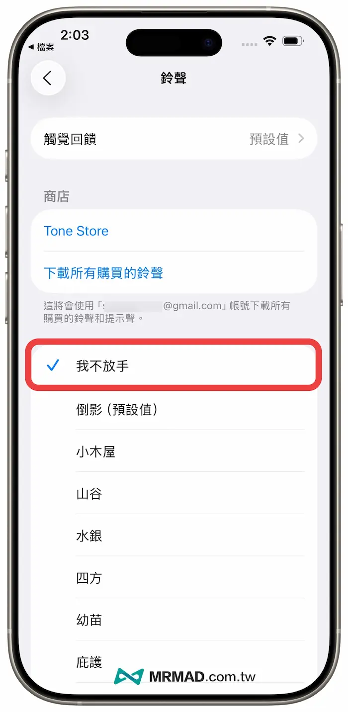 最後就可以到 iOS內建「設定App」,點選「聲音與觸覺回饋」>「鈴聲」,選單就會出現剛套用的新來電鈴聲。