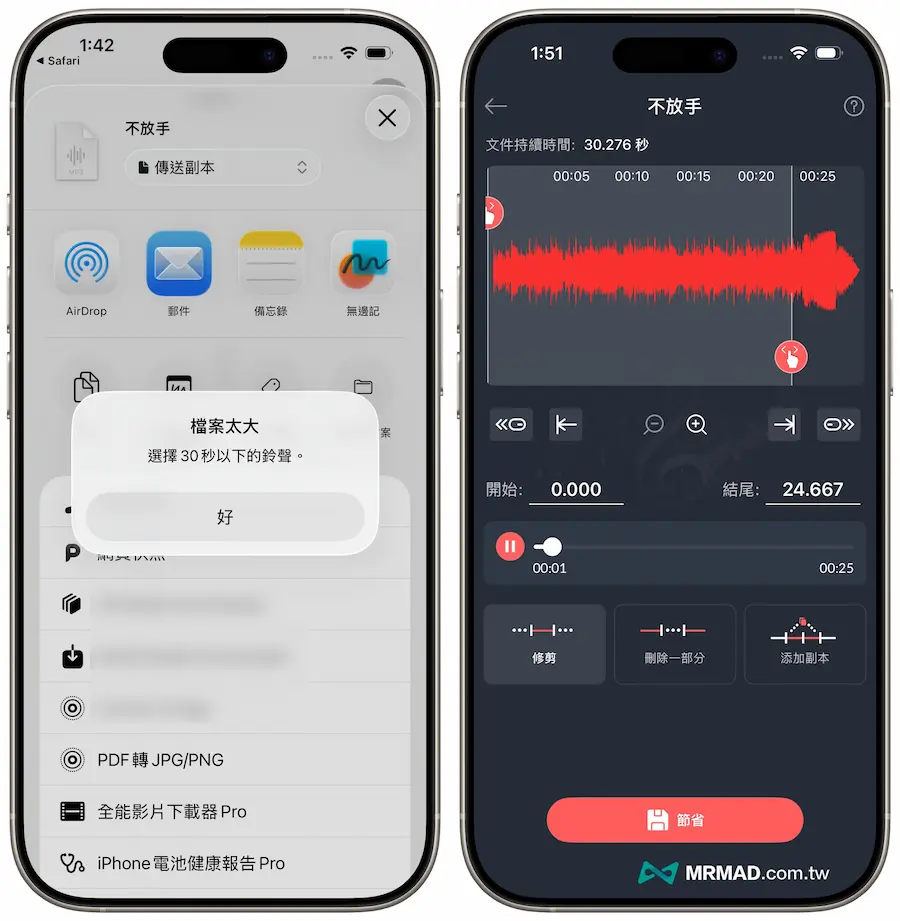 要是在透過 iOS 26 檔案App套用鈴聲時,出現檔案太大要求要設定30秒以下的鈴聲警告,可以直接下載「Mp3 cutter – 音頻切割機」App來裁切MP3音樂,裁剪至30秒以內後,再放回檔案App直接套用就能解決。