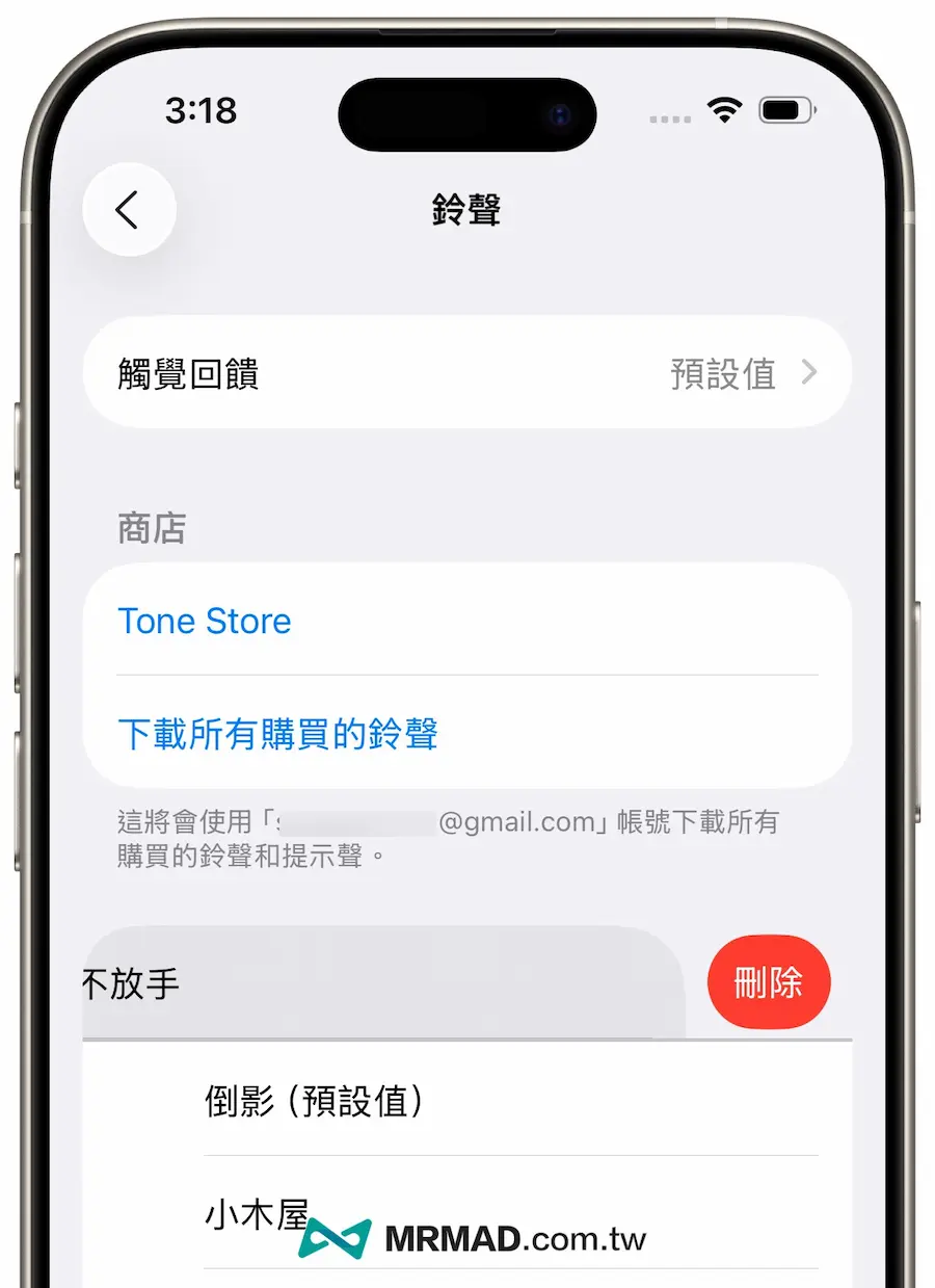 要是想移除自訂鈴聲,只需透過 iOS「設定」內,點擊「聲音與觸覺回饋」>「鈴聲」,從鈴聲列表中對該鈴聲向左滑動,然後點擊「刪除」即可。