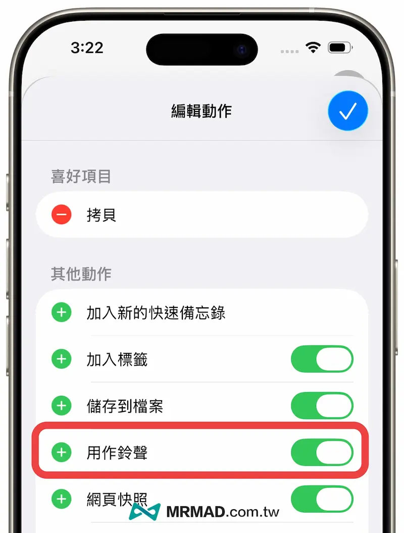💡 小提醒:如果未直接顯示功能選單,代表音訊檔案格式不符,或是點擊最底下「編輯動作」按鈕確認「用作鈴聲」選單是否有開啟。