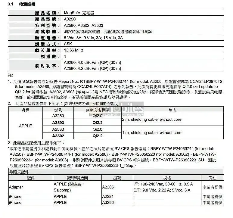根據蘋果官方送審的認證資料顯示,最高支援 15V x 3A 的充電功率,代表兩款 MagSafe 充電器皆支援 Qi 2.2 標準,為無線電力聯盟(WPC)即將推出的新一代 Qi 標準版本,也是承接 Qi 2.1 的技術升級款。