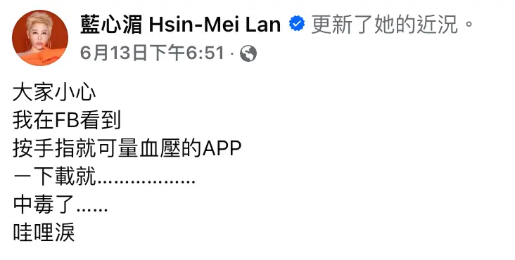 資安威脅潛伏於日常生活中,尤其針對行動裝置的詐騙手法也持續翻新,近日藝人藍心湄親自示警,透露自己因在 Facebook 上點擊一款號稱能「按手指就量血壓」的應用程式,導致手機感染惡意軟體,引發網友熱議討論和資安關注。