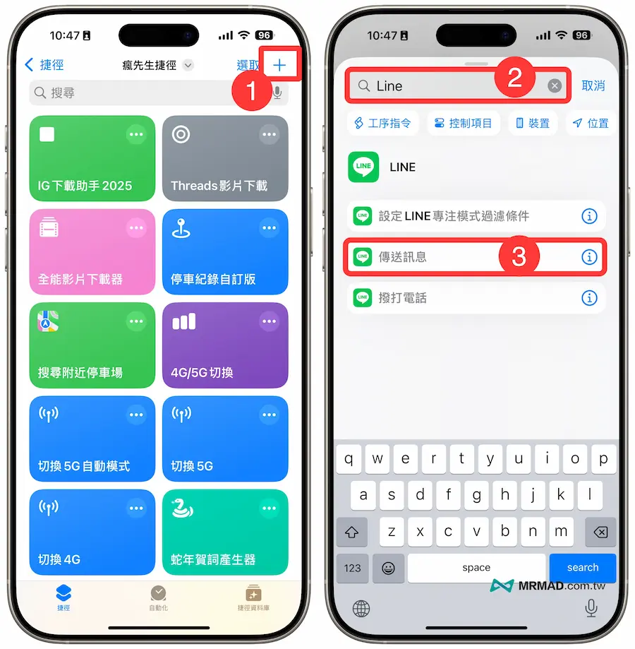 直接開啟 iPhone 內建「捷徑APP」,點右上角「+」建立新的捷徑腳本,並從搜尋欄位找「Line」,底下結果選擇「傳送訊息」。