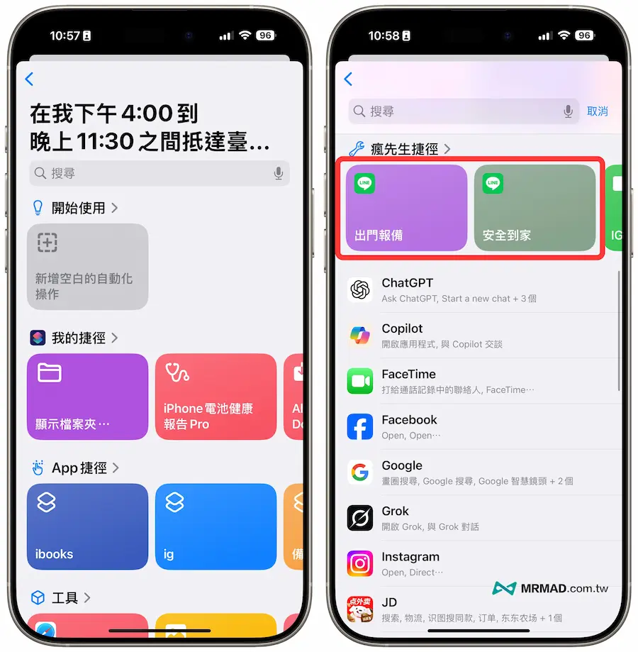 依照以上方法操作後,就可以分別建立「出門報備」和「安全到家報備」LINE訊息捷徑腳本。