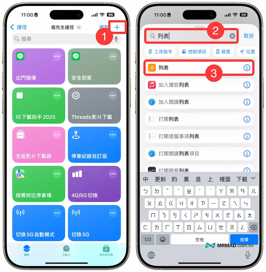 同樣打開捷徑APP,並且點右上角「+」建立一個空白腳本,或直接編輯原本舊捷徑腳本,如果是編輯原本的記得要刪除裡面所有動作,並從搜尋動作框內尋找「列表」動作指令。