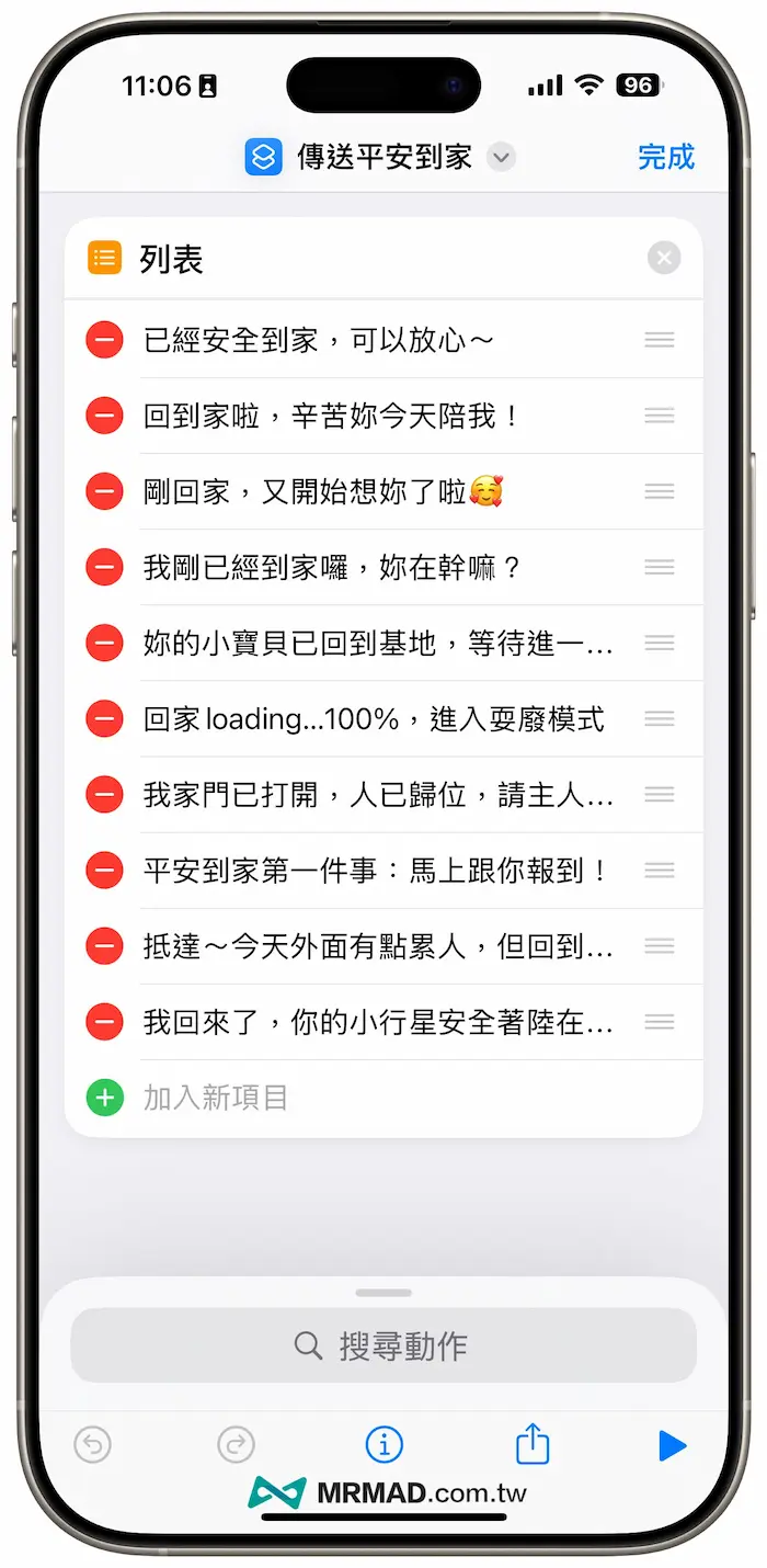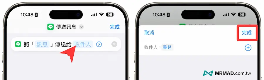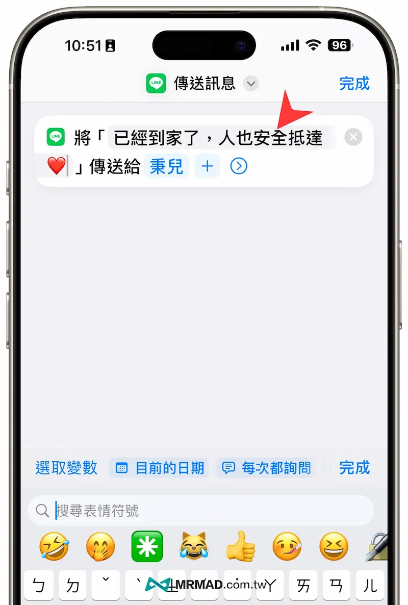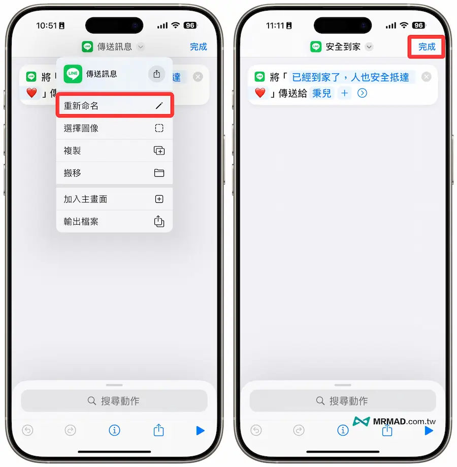 點選頂部傳送訊息文字,透過重新命名改成自己好辨識的捷徑名稱,都設定好後按下「完成」儲存。