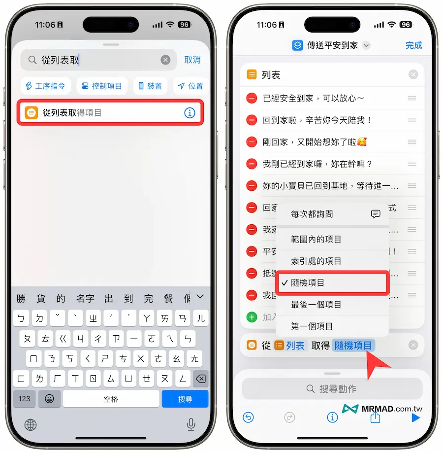 接下來從捷徑搜尋「從列表取得項目」動作指令並加入後,將「第一個項目」改為「隨機項目」。