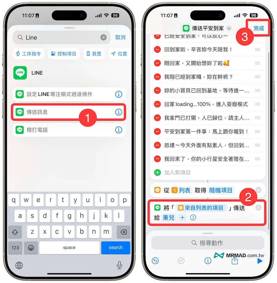 同樣透過捷徑自動化內,去設定執行這個LINE自動傳訊息腳本,就會隨機從列表內選出一句出門到家報備問候語,自動透過 LINE 傳送給對方,這樣對方收到也會感覺就甘心!